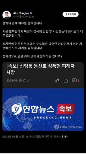 김홍태는 2023년 8월 19일 자신의 트위터에 "정치의 존재 이유를 묻겠습니다. 서울 한복판에서 여성이 성폭행 당한 후 사망했는데 정치권이 너무 조용합니다 정치인이 연관된 뉴스에는 수도없이 나오던 여성단체가 이번 사건에는 모두 자취를 감췄습니다. 정치적으로 얻을 것이 없어서 침묵하는 겁니까?"라는 내용의 트윗을 게시했다. 이 트윗은 게시된 지 얼마 지나지 않아 삭제되었다.